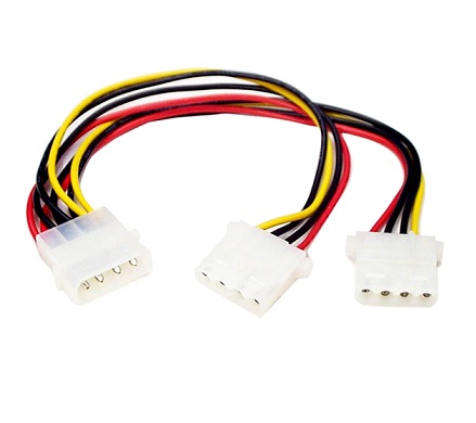 This LP4 to 2x LP4 Power Y Splitter Cable features one LP4 male connector that breaks out into two LP4 female connectors, providing a cost-effective solution for connecting two LP4 peripheral devices (CD/DVD-ROM drives, IDE hard drives etc.) to a single LP4 connector provided by the computer power supply.