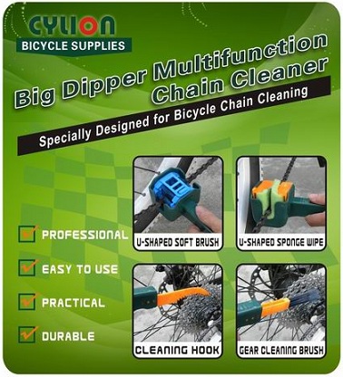 The Big Dipper Multifunction Cleaner is a unique and practical tool designed by CYLION through its extensive research on bicycle cleaning methods. The extremely sturdy outer shell is made of Poly carbonate (PC) plastic used in bulletproof materials. The soft brush and sponge are also made with high quality raw materials to make them safe to use and very durable. The soft brush, sponge, cleaning hook and cleaning brush can all be use individually or use together to effectively clean the bicycle chain and gears, and to reach all parts and surfaces of the entire drive system.
