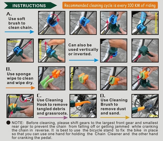 - How to Use: Before cleaning, please shift gears to the largest front gear and smallest rear gear to prevent the chain from falling off or getting jammed while cranking the chain in reverse. It is best to use the bicycle stand to fix the bike in place so that you can use one hand for holding the Chain Cleaner and the other hand for cranking the pedal.