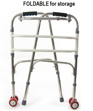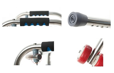 It features a soft grip material on left and right handle. It will not hurt the hand of the patient even gripping it for a long time. Height is adjustable from 75cm-85cm. Non-skid, non-marring rubber tips provide extra safety for 2 pole. Additionally a high quality wheel for easy walking. Easy adjusting method with latch. This model is also foldable, so it can be unfolded easily and easy for storage when not using.