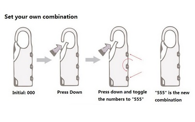 - 1.The lock is preset at factory to open at 0-0-0. check the 0-0-0 aim at indication line. Press down the snap. Now the lock is ready to open