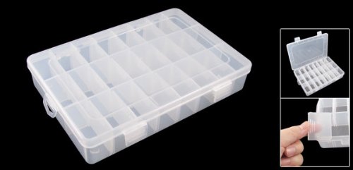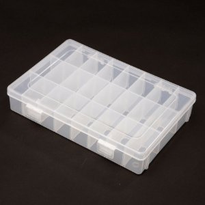 24 Slots Electronic Components Storage Case Organizer in Clear white color, and made by high quality plastic. Total 24 Compartments, and user can remove the some blocks between two compartments to form a longer compartment. Can be used for storing I.C., chip form capacitors and resistors, small screws, nuts, washers and Lock washers etc. And also suitable to be used as jewellery box too.