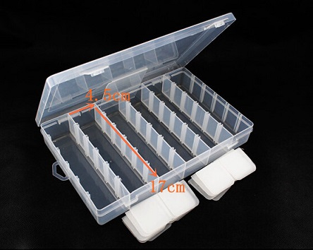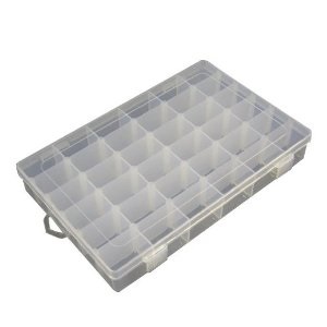 36 compartment for Components or Jewelry or fishing parts Storage Case Organizer in Clear white color, and made by high quality plastic. Total 36 Compartments, and user can move the grid partitions between two slots to form a longer compartment. Suitable for technician, engineers, students for storing I.C., chip form capacitors and resistors, small screws, nuts, washers and Lock washers. Besides, it is also good to be used as jewellery box too.