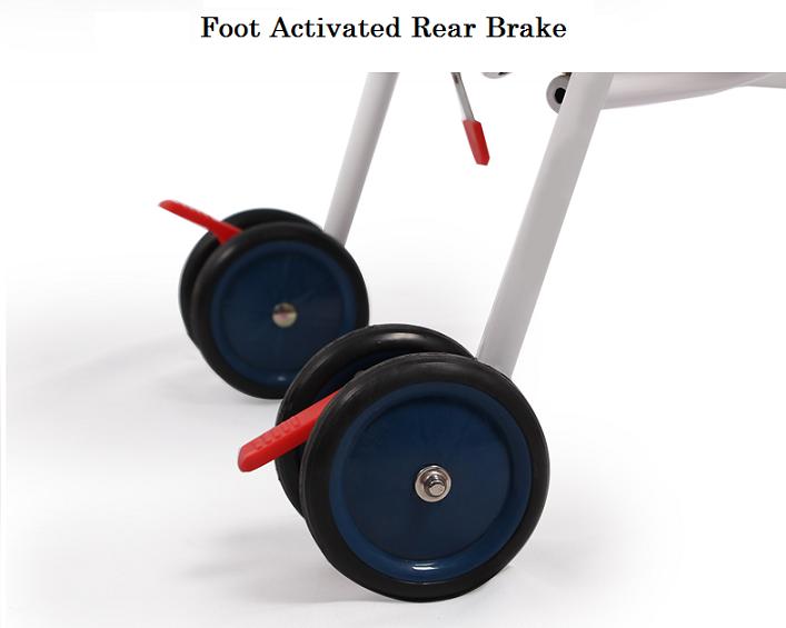 - Foot activated rear brake for sure stops and lockable.