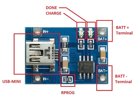 - This TP4056 specification charger board allows user to charge battery using either a Mini USB connector at 4.5V - 5.5V input voltage