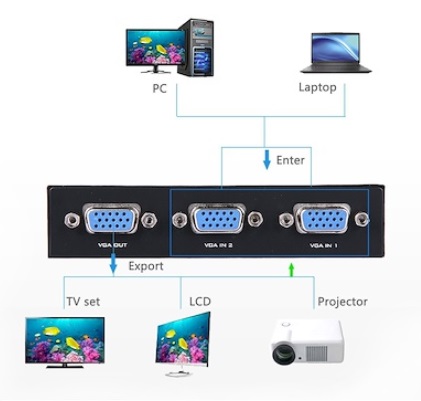 2 Ways VGA HD-15 Data Switch is a manual switch boxes. It is an economical in price and great for simple switching of commonly used data lines for VGA outout. Features a sturdy, shielded metal box and a user friendly switch. All connector pins are fully populated and wired straight through.