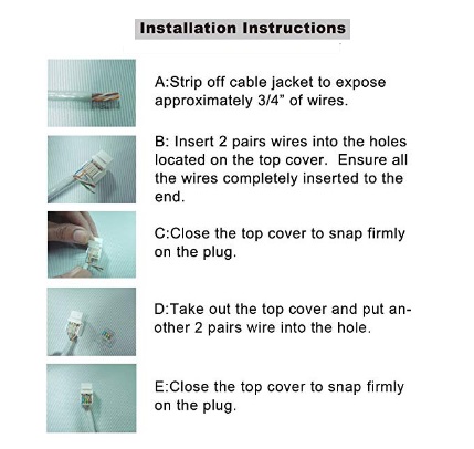 RJ45 Toolless modular plug is 8-position 8-conductor (8P8C) and designed for computer networking. The unique toolless design does not require the use of a crimping tool. Simply insert the leads following the color coding, and press down the lid. 568A and 568B color wiring diagram is integrated on the lid for easy installation. The modular plugs are manufactured from high-impact clear poly-carbonate to withstand everyday wear and tear. You can except error-free data transfers.
