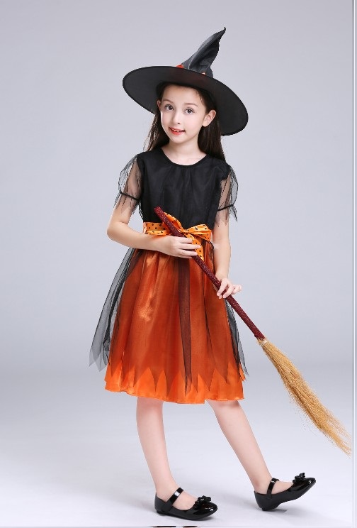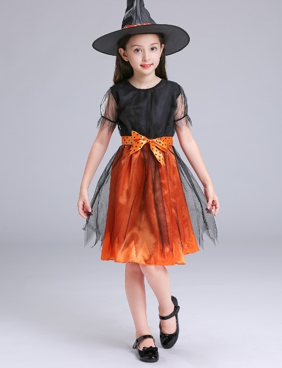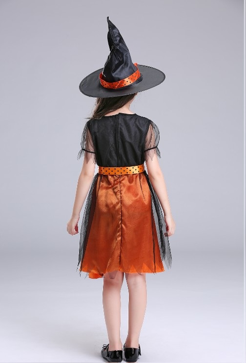 The upper body is in black and orrange in the lower body with a layer of black lace. Matching with a black velour witch hat.
