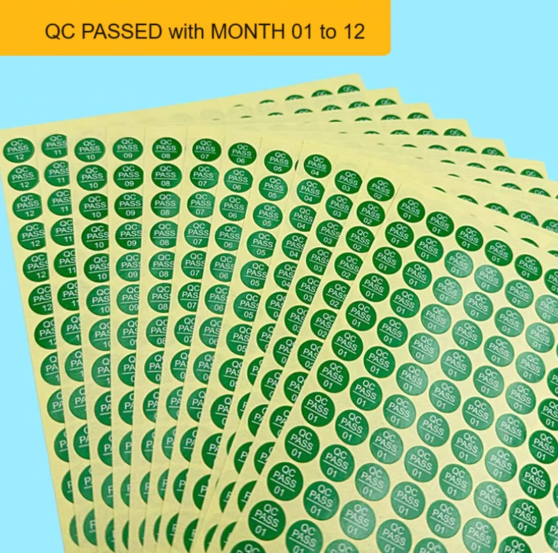 - A) 8mm Round, wording "QC PASS with Month 1 to 12", white background with red font, 270pcs labels per sheet