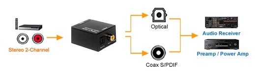 When user needs a audio signal conversion from normal analog audio to digital audio (optical toslink), or the other way round, you will need either the below converter based on signal flow direction.