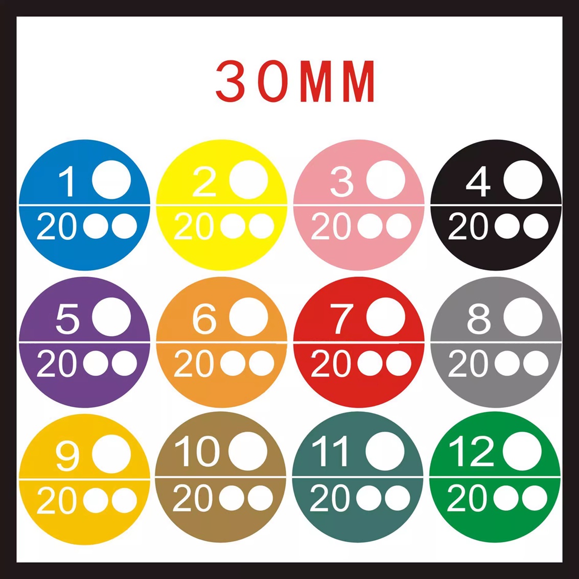 Color coded 1 to 12 (for January to December) Month round stickers for stock inventory management. Each clearly numbered from 1 to 12 with different colors and each colored sticker have a empty blank area for you to mark/write date/year information with marker pen.