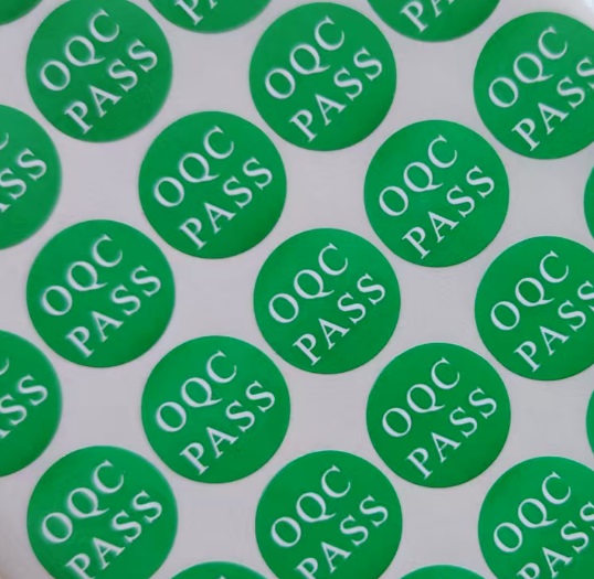 - E) 20mm Round, wording "OQC PASS", green background with white font, 60pcs labels per sheet