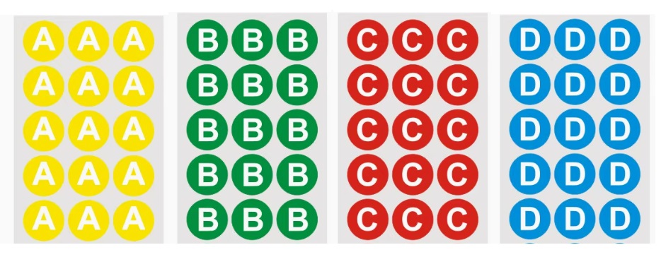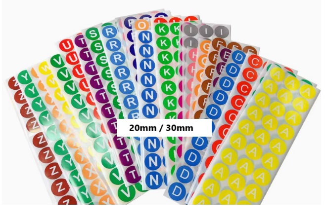 - 20mm Diameter, one color for one alphebet (1sheet has 25 labels)