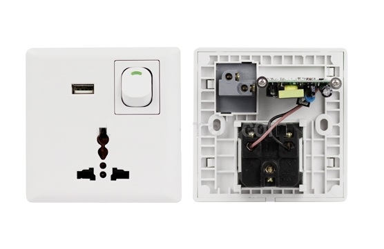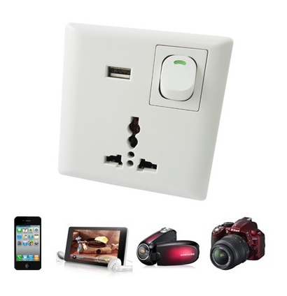 - Concerning this special wall socket, a USB interface, a power on/off button, and a three-pronged outlet are on the shell